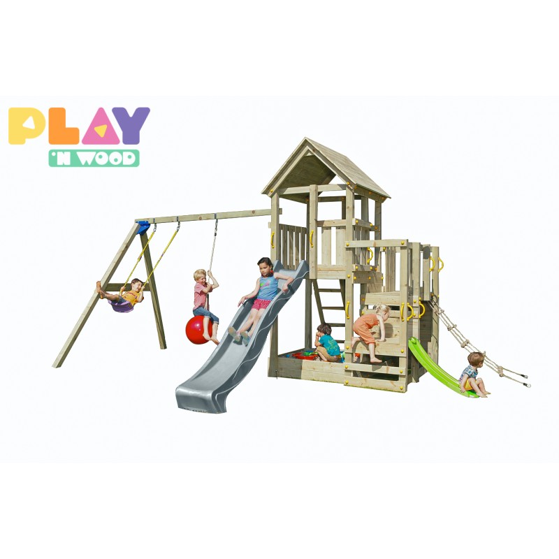 La tour est en bois rabotés section 6,8 x 6,8cm et 8,8 x 8,8 cm pour la tête de portique sont imprégnés en classe IV, ce qui permet de garantir ce jeu pour 10 ans contre la pourriture et les attaques d’insectes.