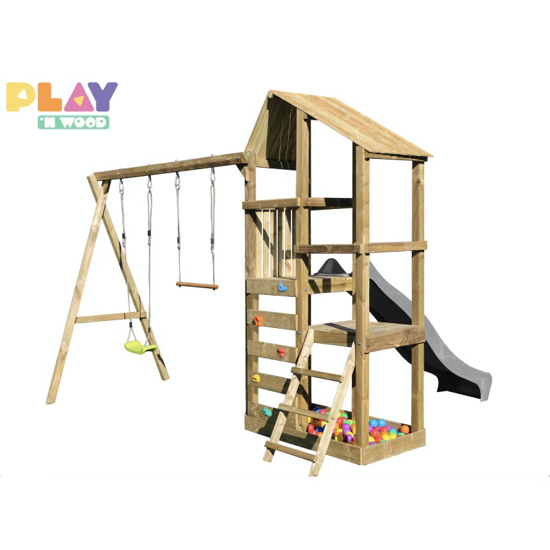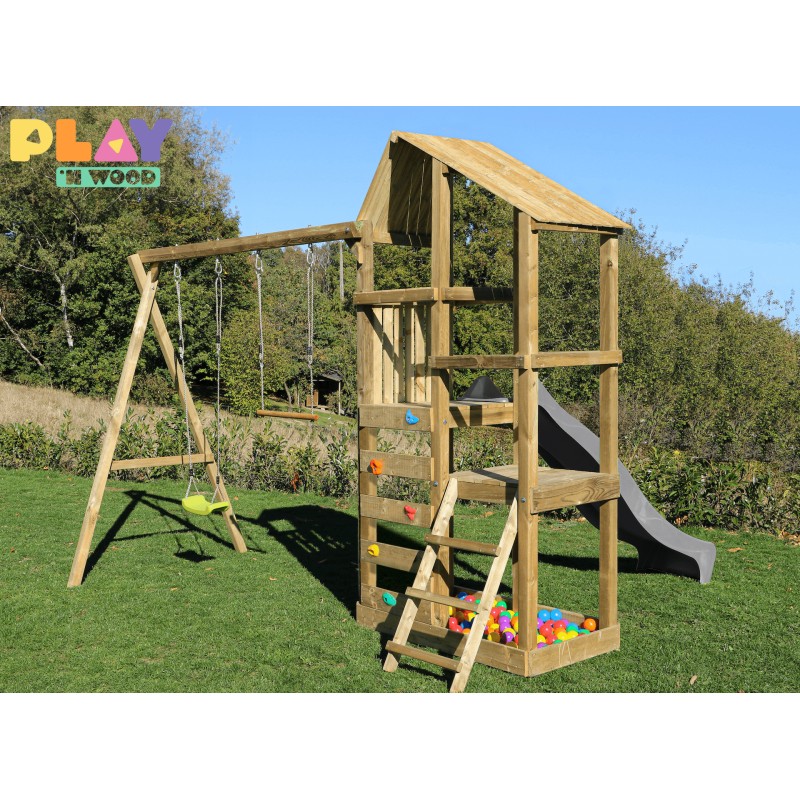 Cette splendide tour comprend beaucoup d’options de série afin de satisfaire la curiosité de vos enfants : bac à sable, deux planchers, panneau à grimper, toboggan pour plateforme 120 cm, portique deux agrès …
