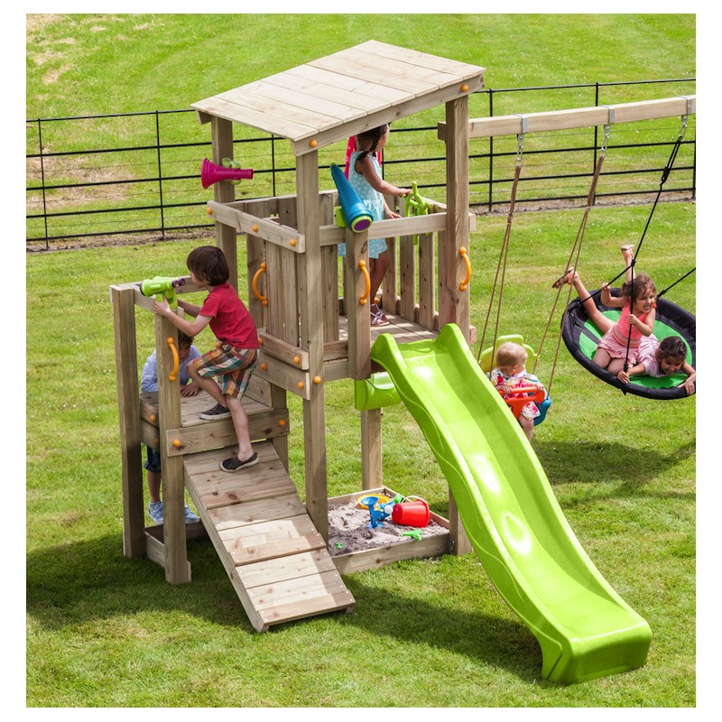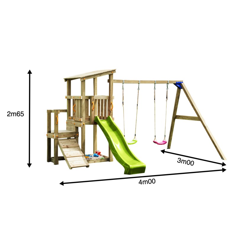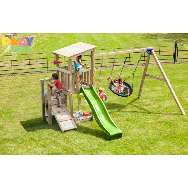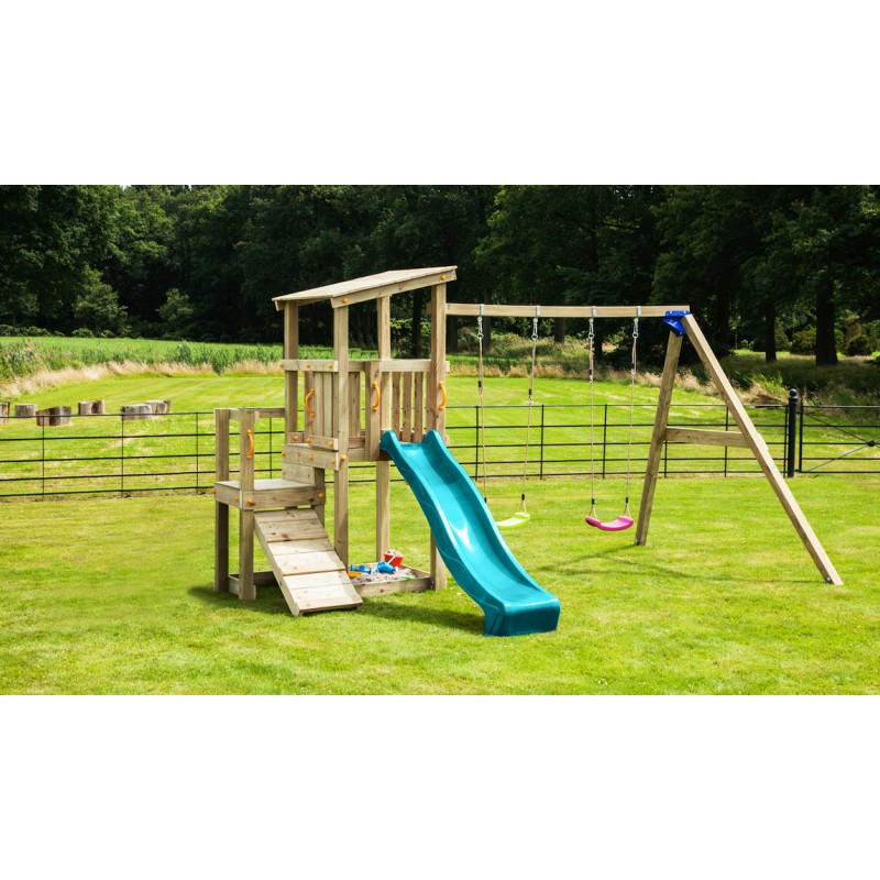 De speeltoren is gemaakt van gefreesde boomstammen, geïmpregneerd met klasse IV. Hierdoor krijgt de set een garantie van 10 jaar lang tegen rot en aantasting door insecten.