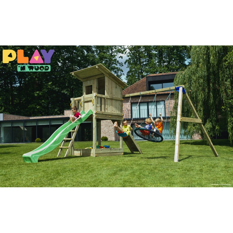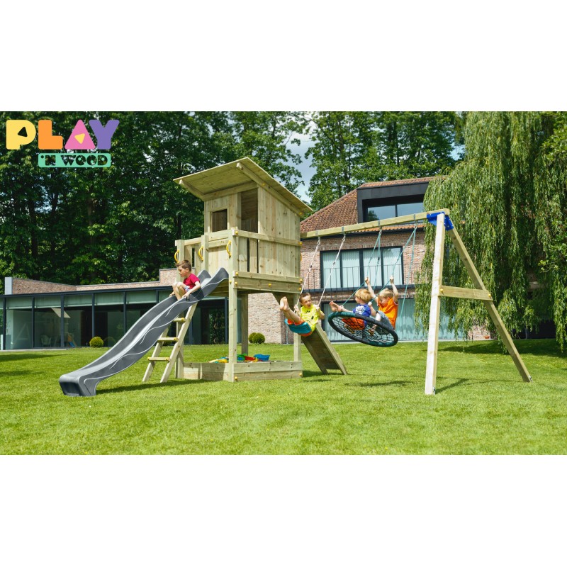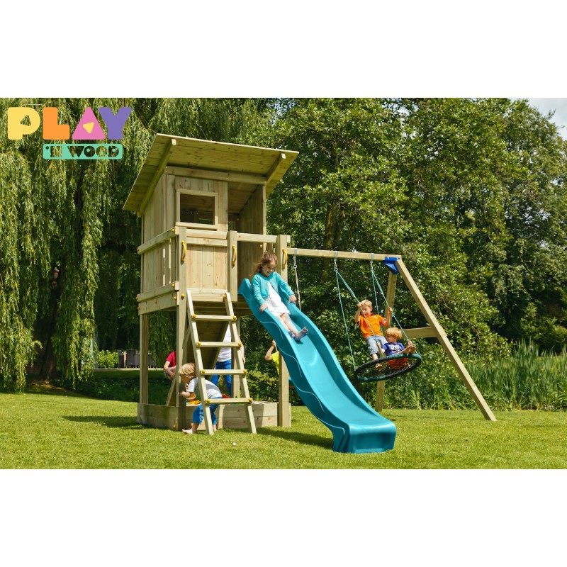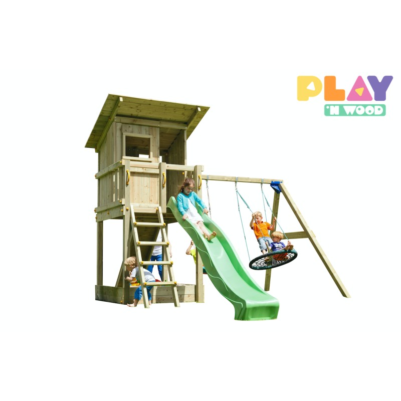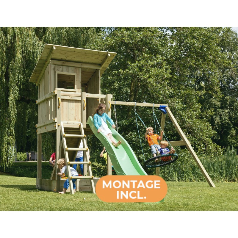 De speeltoren is gemaakt van gefreesde boomstammen, geïmpregneerd met klasse IV. Hierdoor krijgt de set een garantie van 10 jaar lang tegen rot en aantasting door insecten.