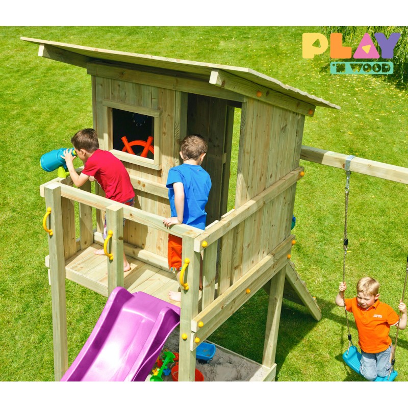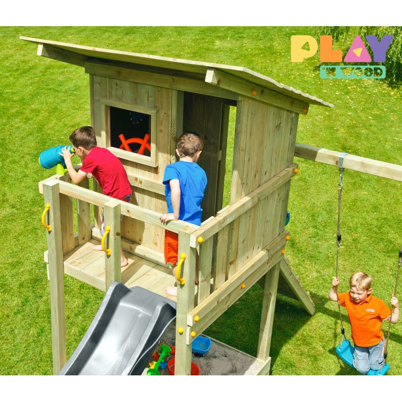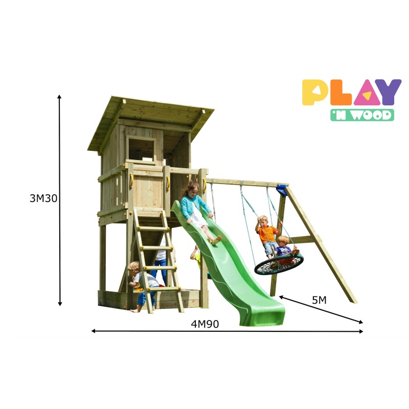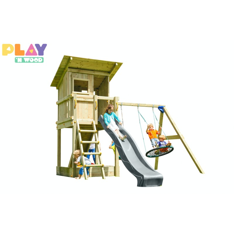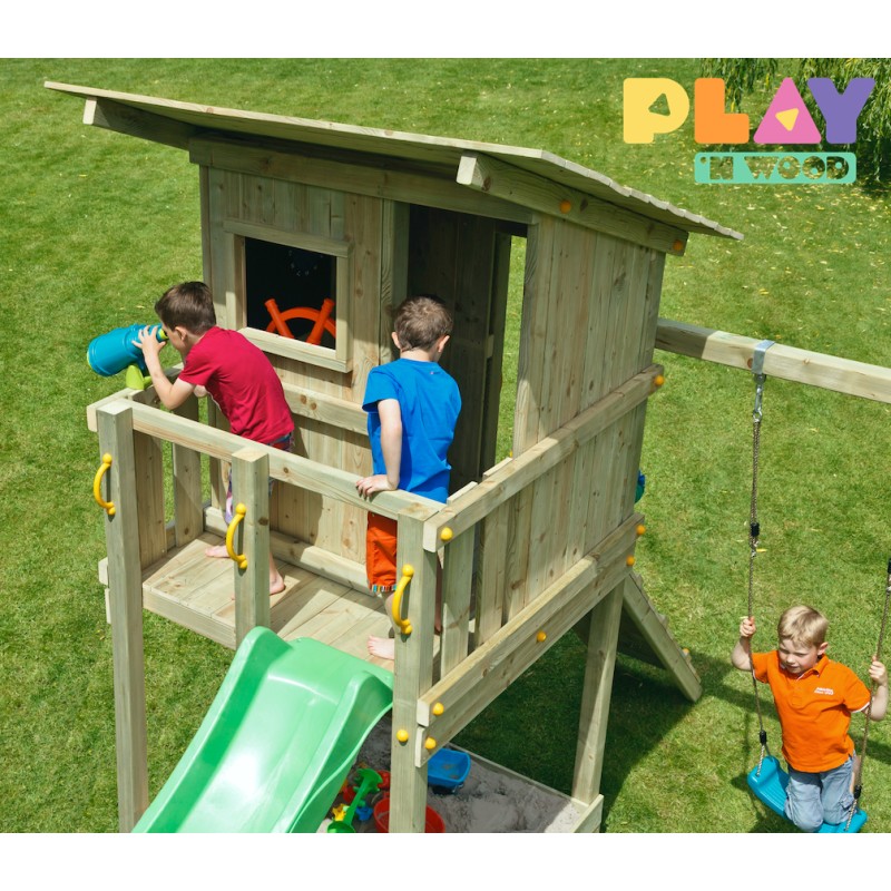 De speeltoren is gemaakt van gefreesde boomstammen, geïmpregneerd met klasse IV. Hierdoor krijgt de set een garantie van 10 jaar lang tegen rot en aantasting door insecten.