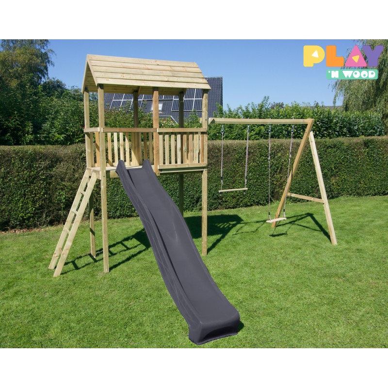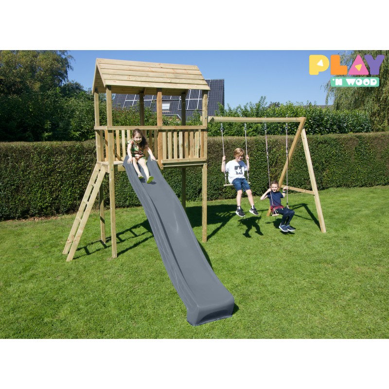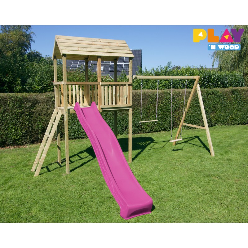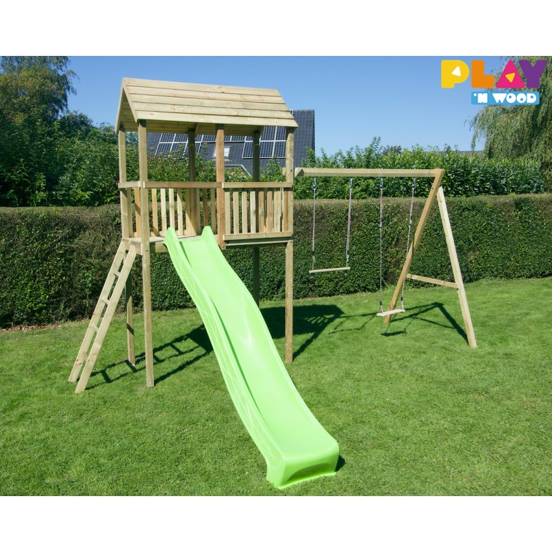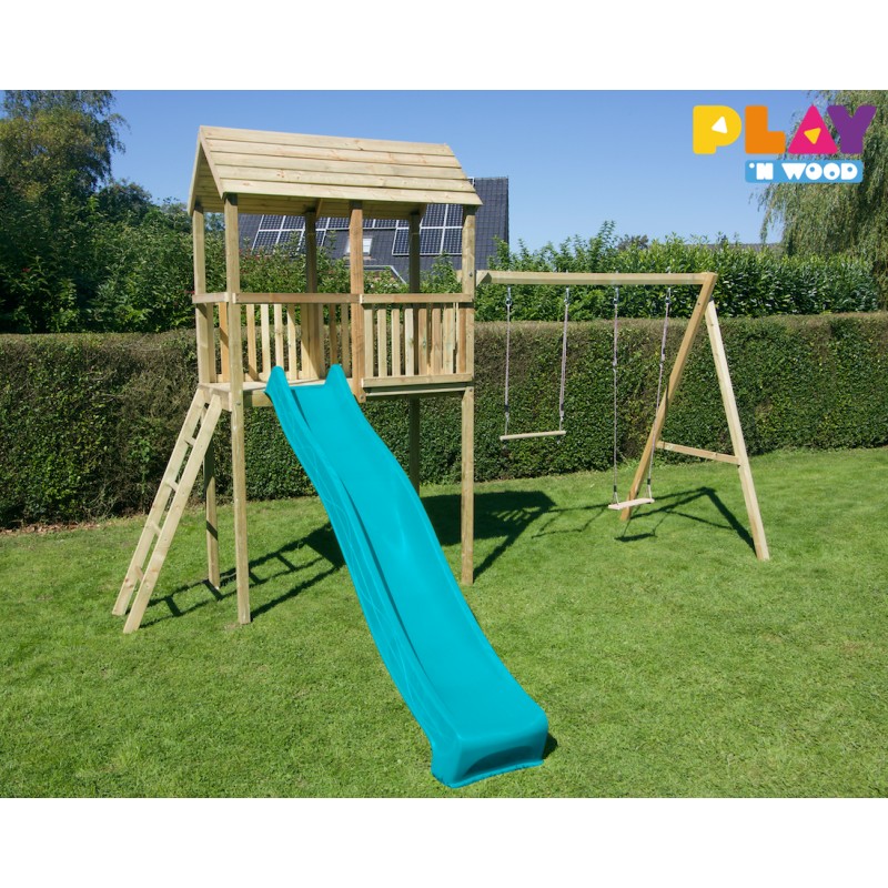 Komt met Tsuri glijbaan van 2,90 meter in een kleur naar keuze: limoengroen, roze, donkergroen en turquoise-groen. Hoogte van het platform 150cm en frame voor 2 schommels.