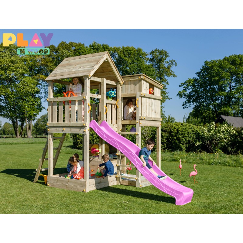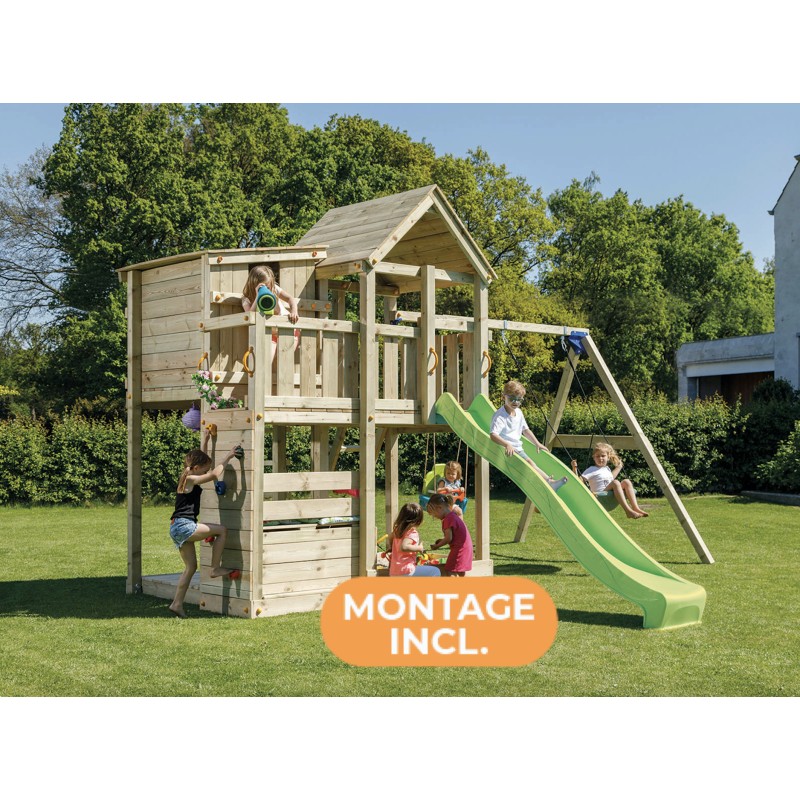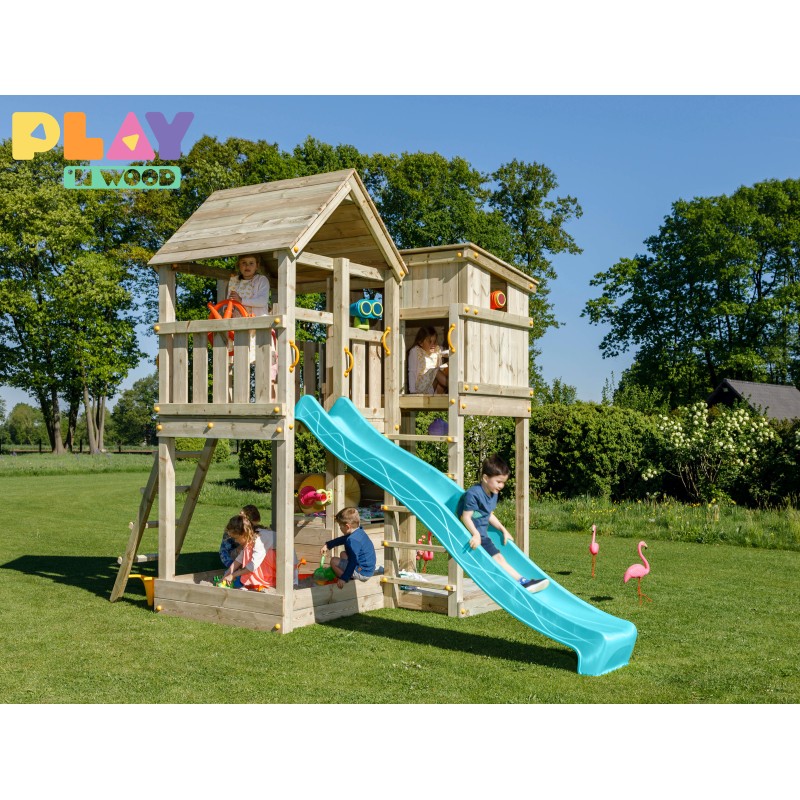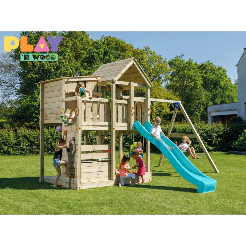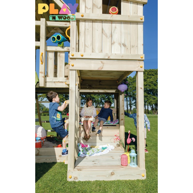 De speeltoren is gemaakt van gefreesde boomstammen, geïmpregneerd met klasse IV. Hierdoor krijgt de set een garantie van 10 jaar lang tegen rot en aantasting door insecten.
