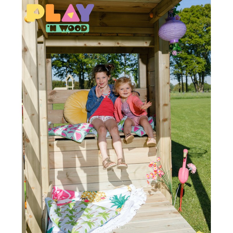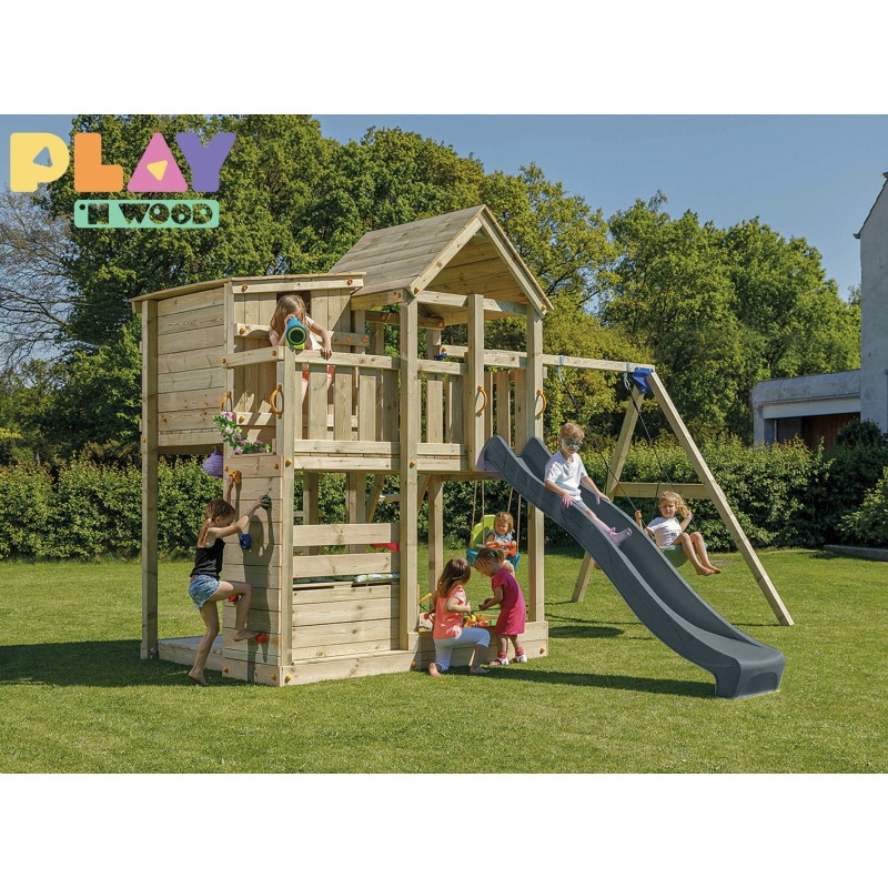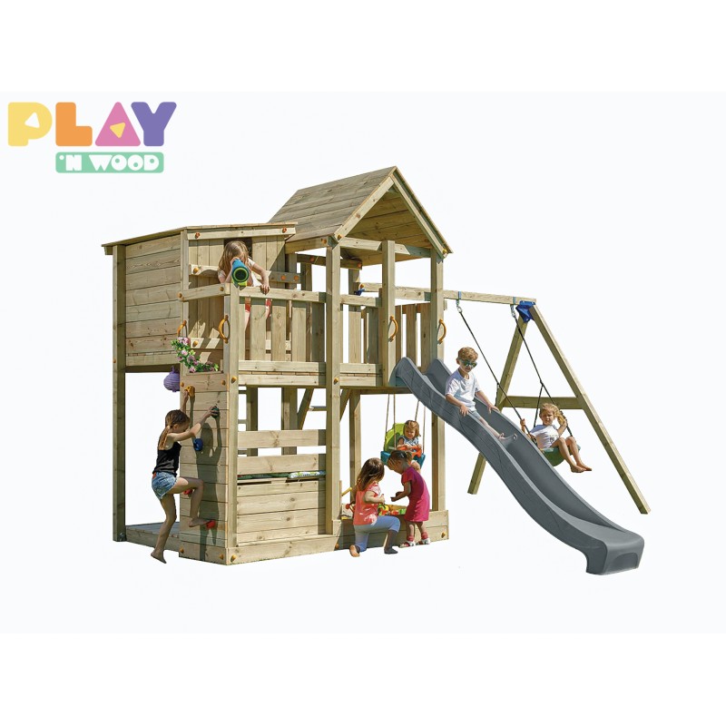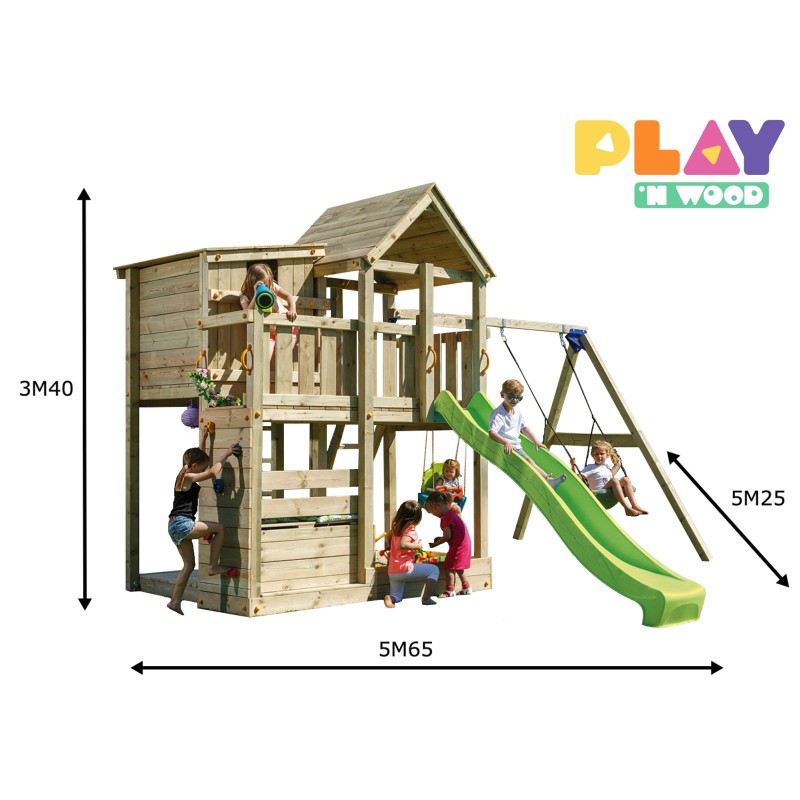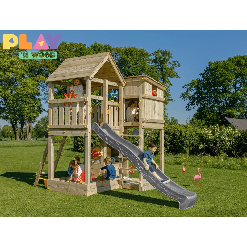 De speeltoren is gemaakt van gefreesde boomstammen, geïmpregneerd met klasse IV. Hierdoor krijgt de set een garantie van 10 jaar lang tegen rot en aantasting door insecten.