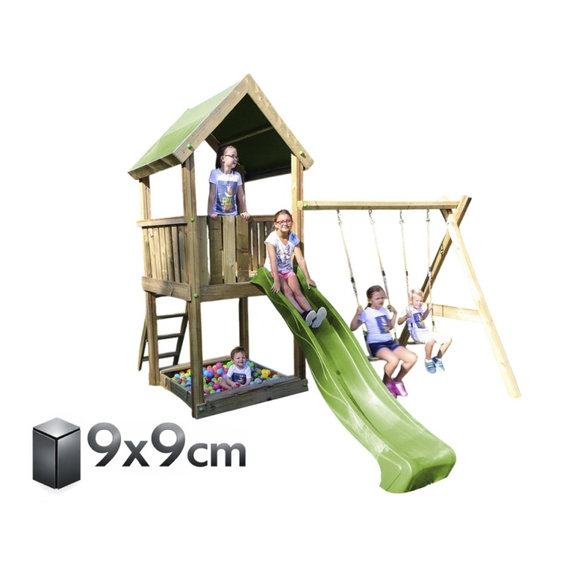Omvat een 2m19 Yulvo glijbaan, een 1m20 hoge vloer , een 4 haaks portiek , een hut en een zandbak.