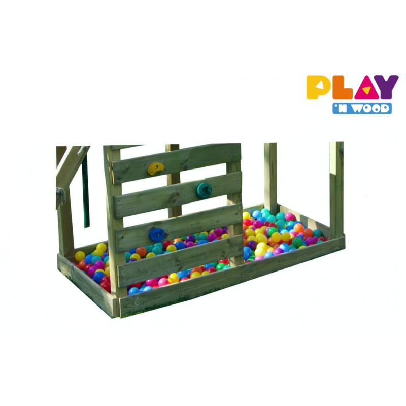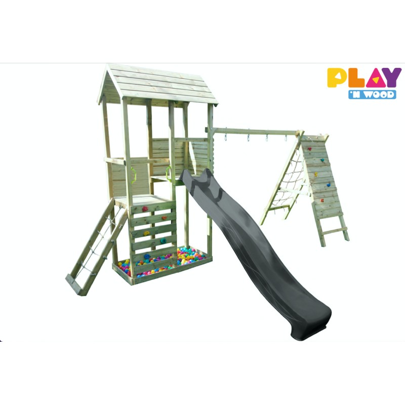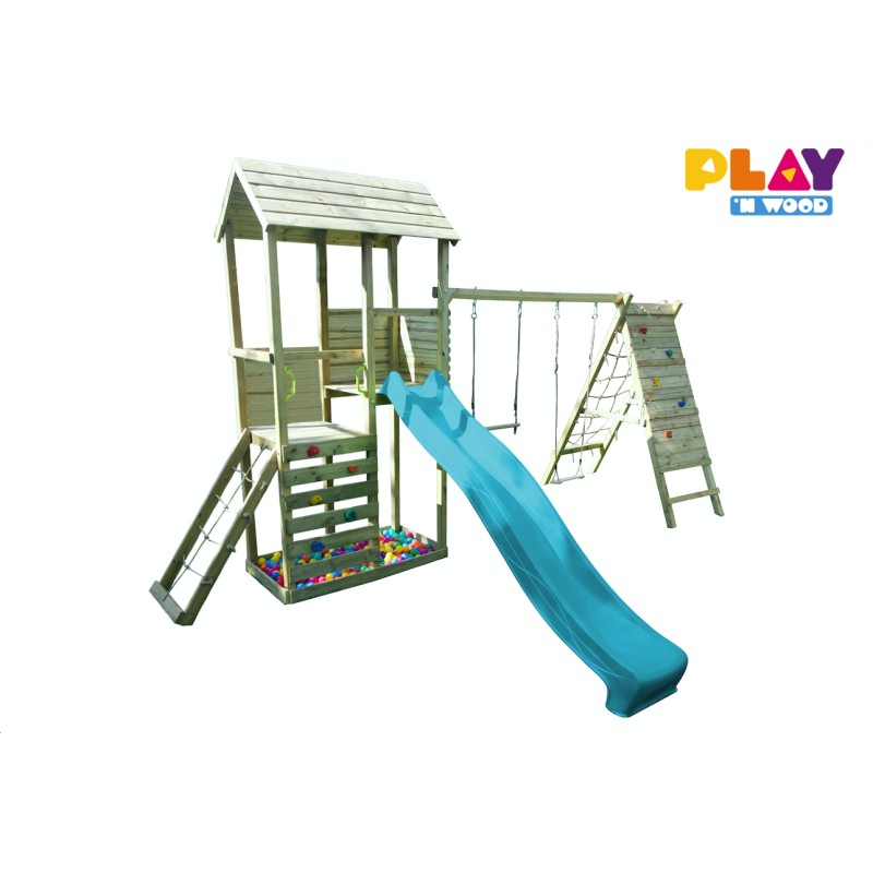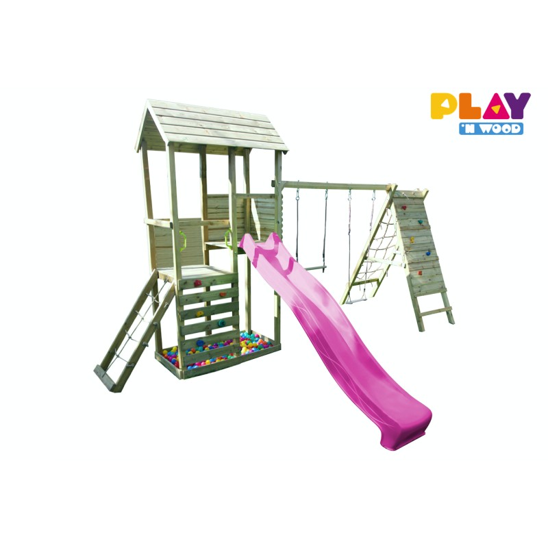 Deze prachtige speeltoren bevat vele standaard opties om de nieuwsgierigheid van uw kinderen te prikkelen: zandbak, twee verdiepingen, klimwand, glijbaan voor het 150cm platform, een frame voor twee toestellen en commando kit…