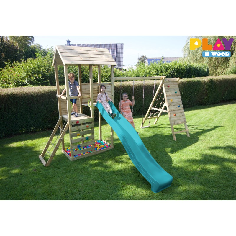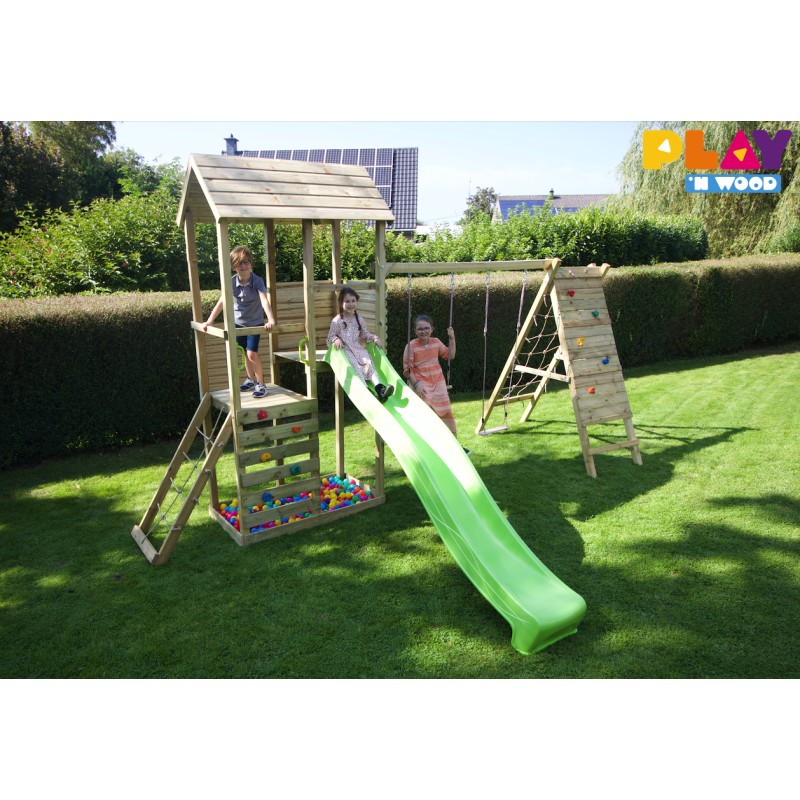 Inclusief een Tsuri glijbaan van 2,90m, een zandbak, een klimwand, twee verdiepingen (120cm en 150 cm) en een frame voor 2 toestellen met commando kit.
