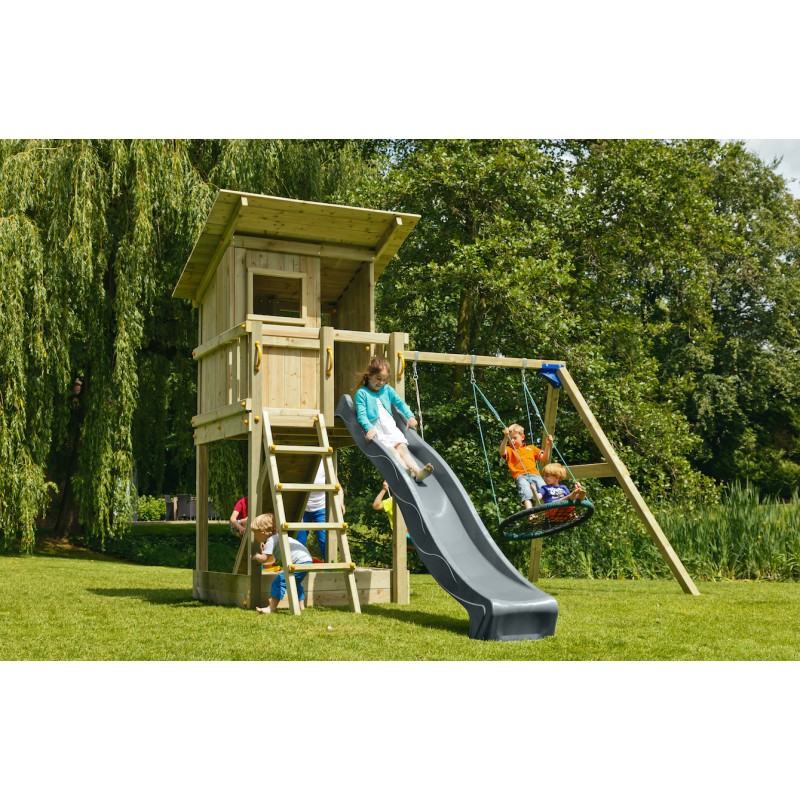 De speeltoren is gemaakt van gefreesde boomstammen, geïmpregneerd met klasse IV. Hierdoor krijgt de set een garantie van 10 jaar lang tegen rot en aantasting door insecten.